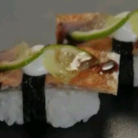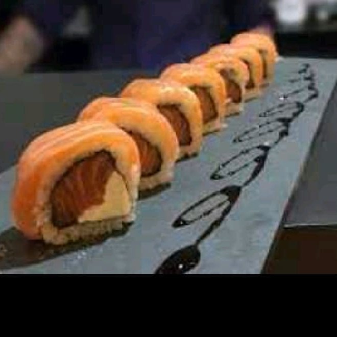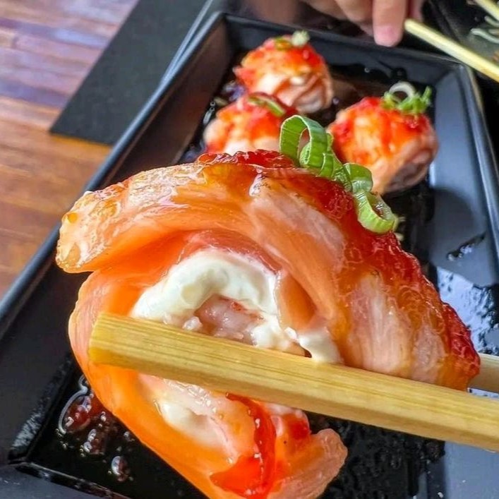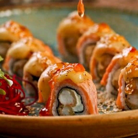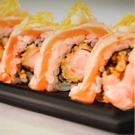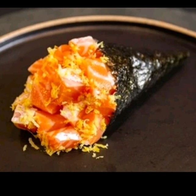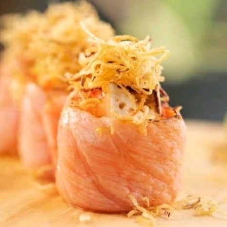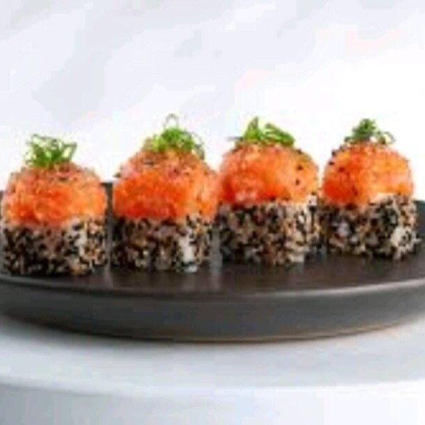 Alga nori coberta com arroz japonês e gergelim, recheada com cream cheese e camarão empanado, finalizado com lâminas de salmão, azeite trufado, flor de salmão e raspas de limão ( flambado)