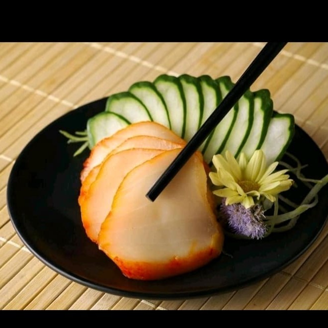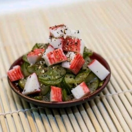 Lâminas finas de pepino japonês e Kani marinado em molho a base de vinagre,sal e açúcar e gergelim