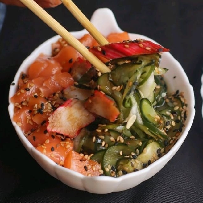 Saladinha de pepino japonês com kani e pequenos cubos de salmão, finalizado com gergelim