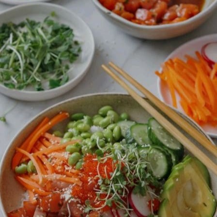 Lâminas de filé de atum por cima do arroz japonês