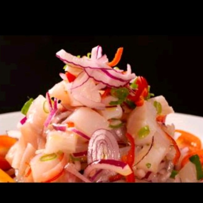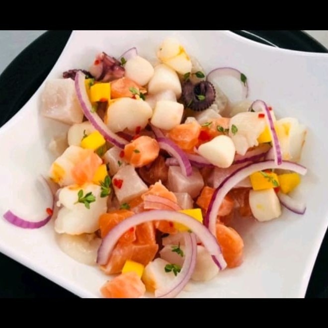 Filé de salmão + filé de peixe branco + cebola roxa + cebolinha + pimenta dedo de moça + manga + molho cítrico a base de limão e laranja levemente picante.