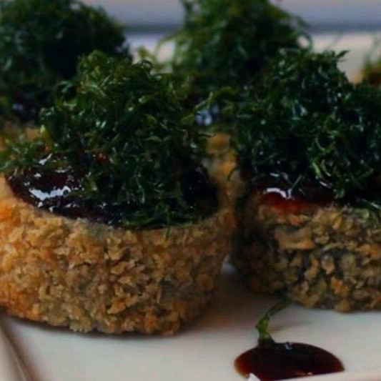 Alga nori recheada com filé de salmão cream cheese e cebolinha, empanado na farinha Panco e frito