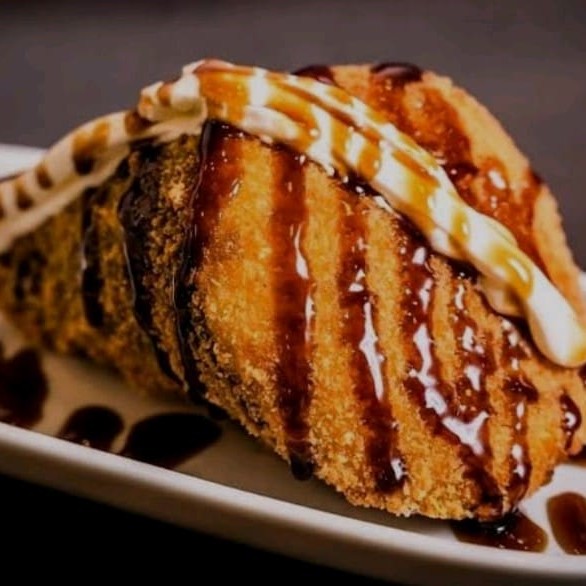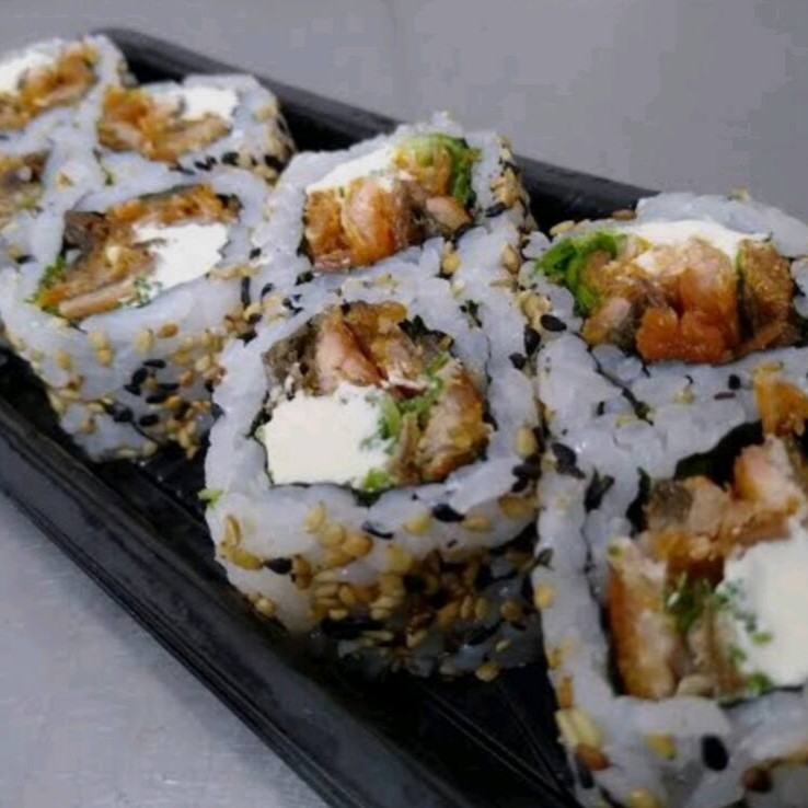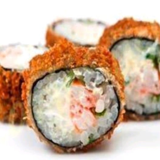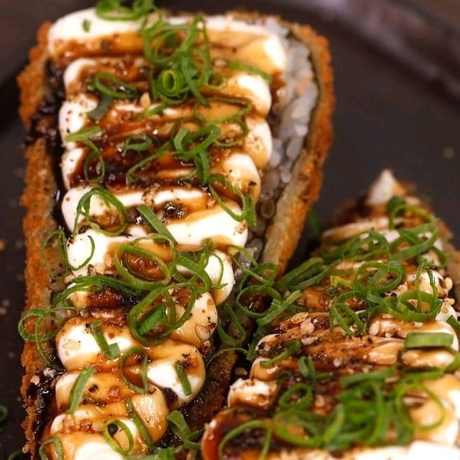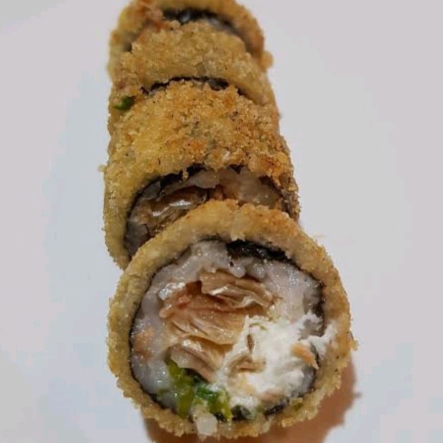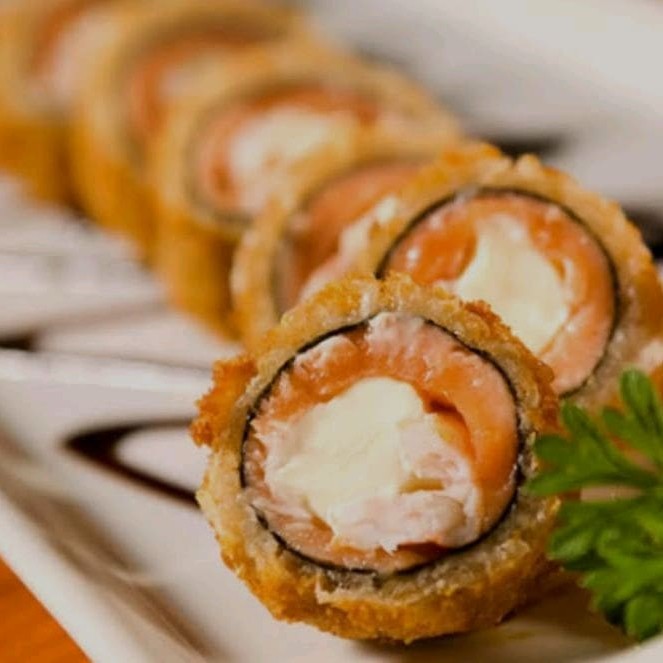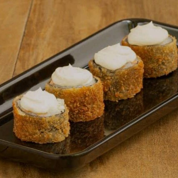Salmão, cream cheese, cebolinha, arroz japonês,alga nori, empanado na Panco e frito bem crocante