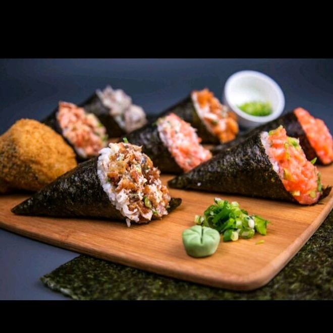 5 joy tartar flambado + 5 uramaki salmão grelhado + 5 hot chega + 5 hot couve + 5 sushi salmão flambado + 5 sushi skin