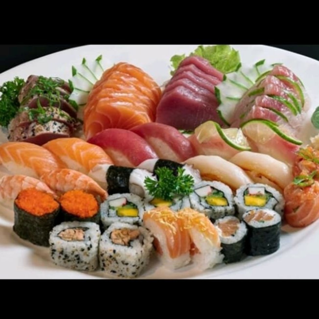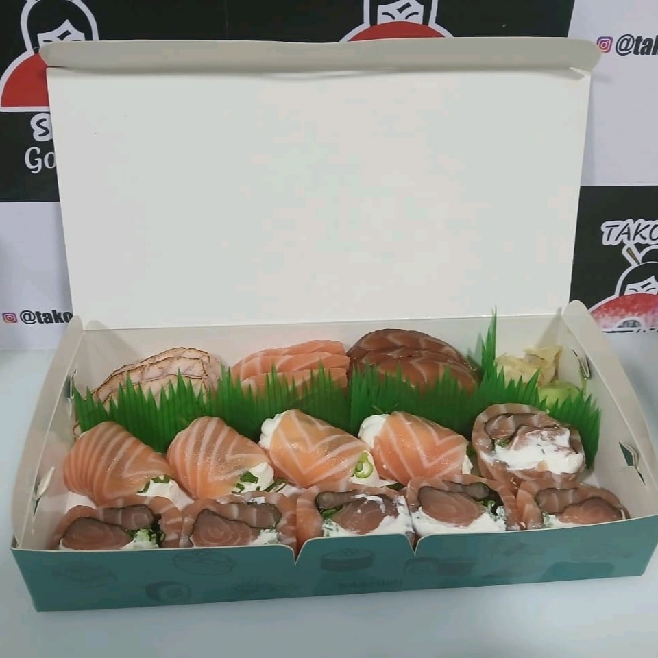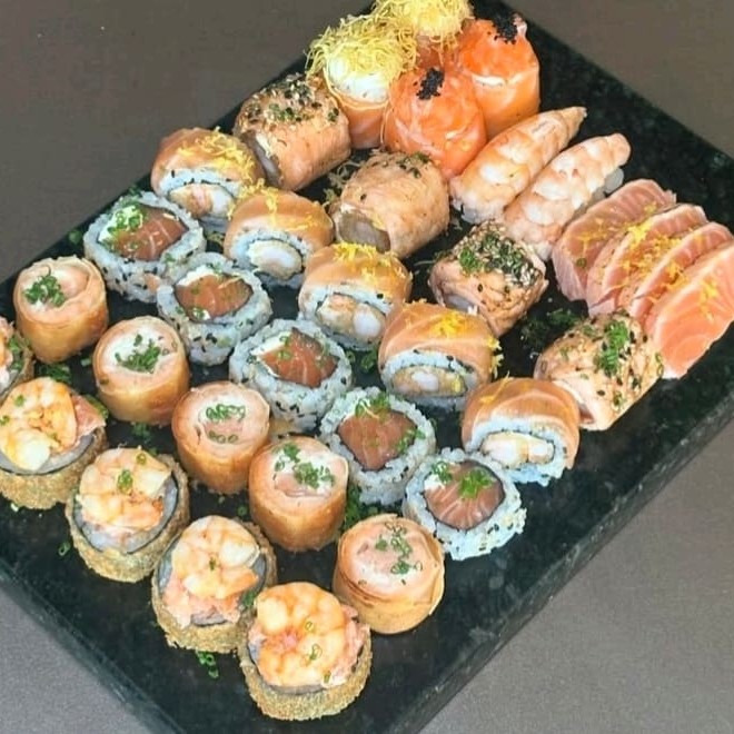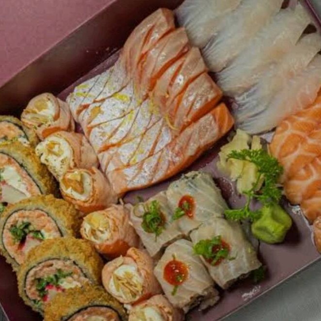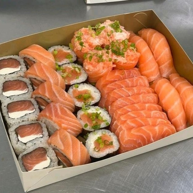 10 sashimi + 4 Joy tartar + 5 uramaki salmão especial + 5 uramaki Filadélfia + 5 hossomaki + 4 sushi salmão