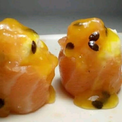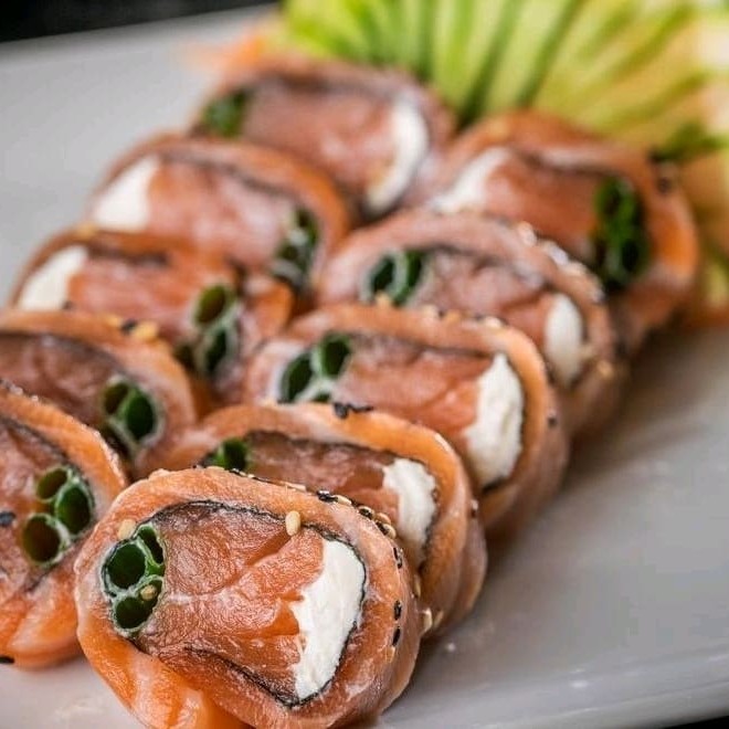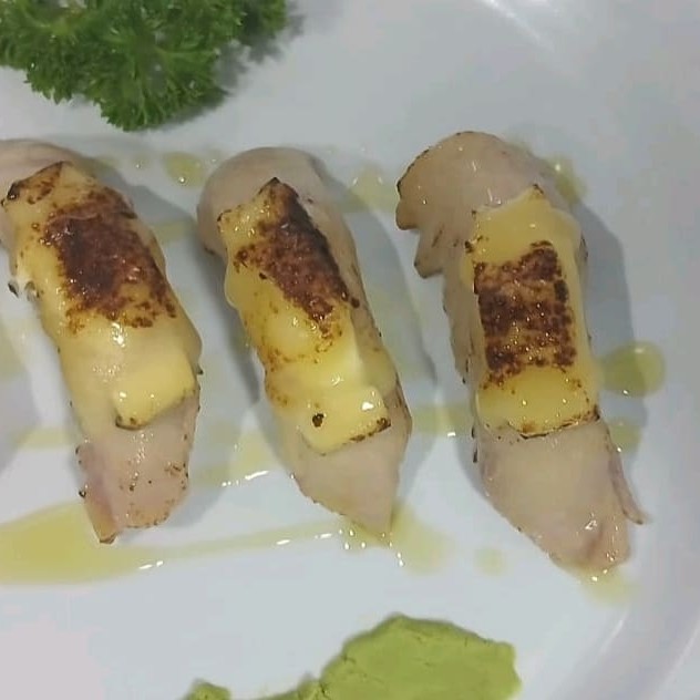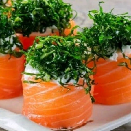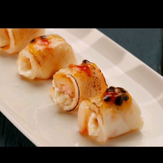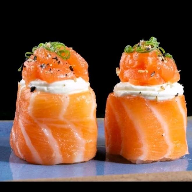 Lâminas de salmão levemente flambadas, recheada as com filé de camarão,cream cheese, finalizadas com geleia de pimenta e cebolinha