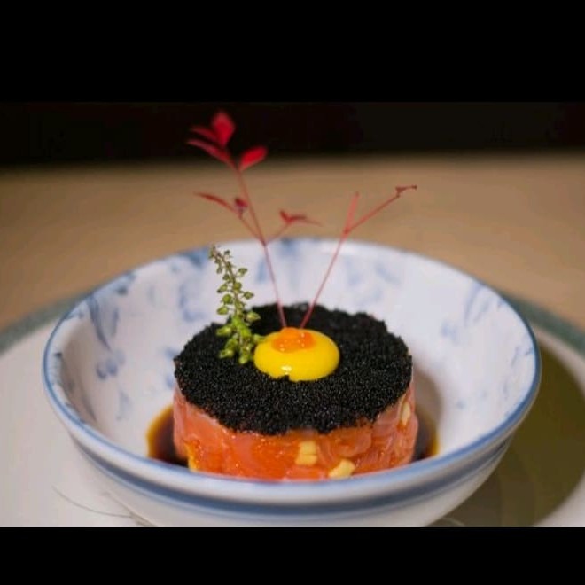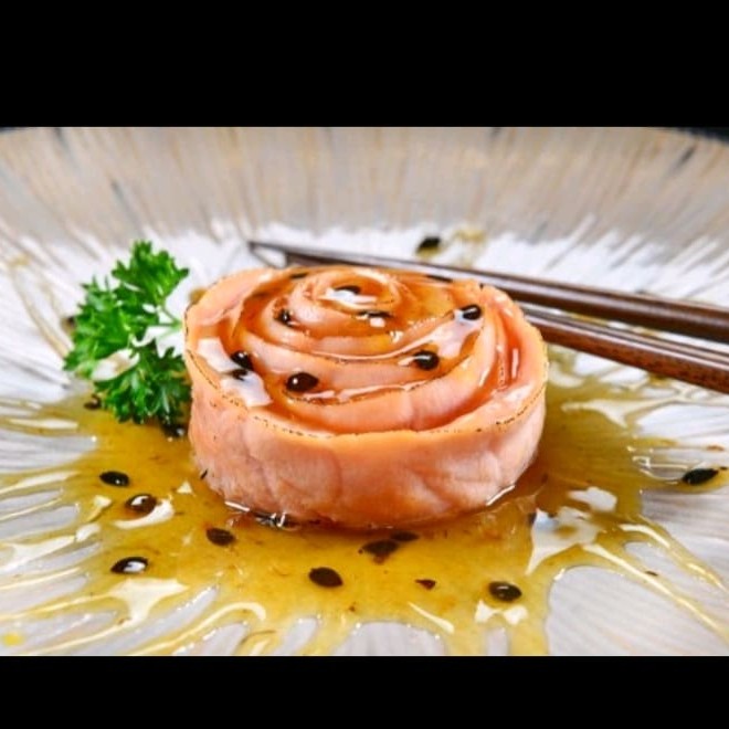 Filé de salmão com ovas de masago,marinados em molho ponzo finalizado com ovas Black e ovo de cordona