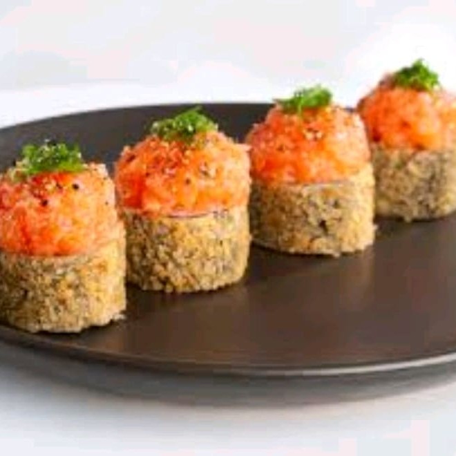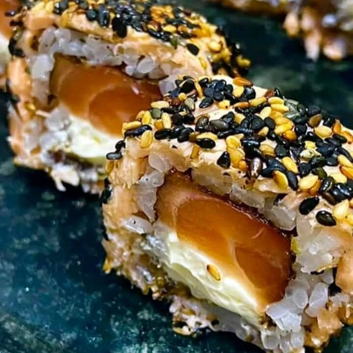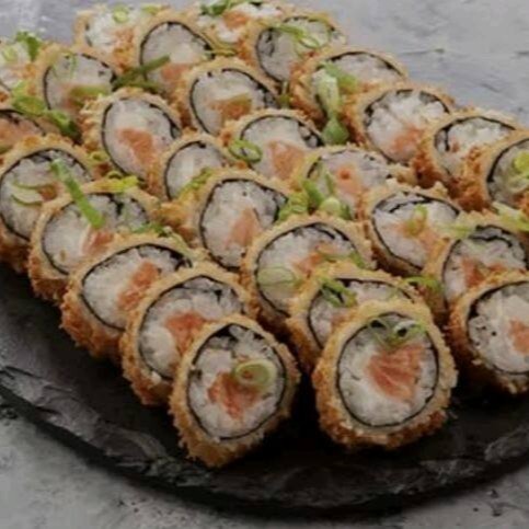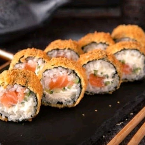 Alga nori recheada com arroz japonês, cream cheese, cebolinha e uma filé de salmão em cubos, empanado na farinha Panco e frito