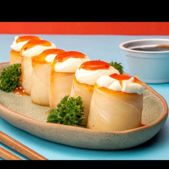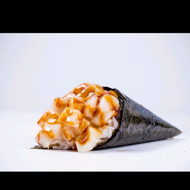 Casquinha de harumak crocante recheada com, cream cheese, cebolinha, arroz japonês, salmão e camarão