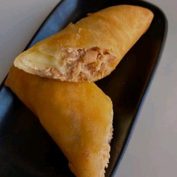 Massa de harumak recheada com filé de salmão, cream cheese e cebolinha, frito bem crocante