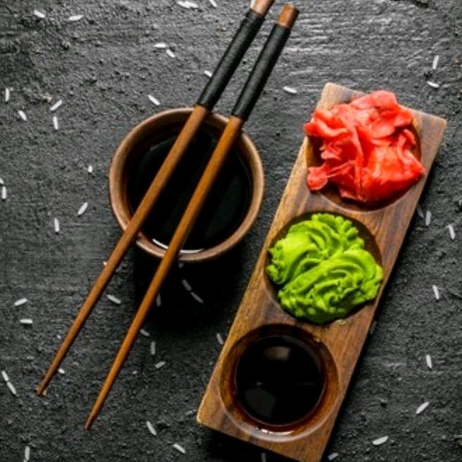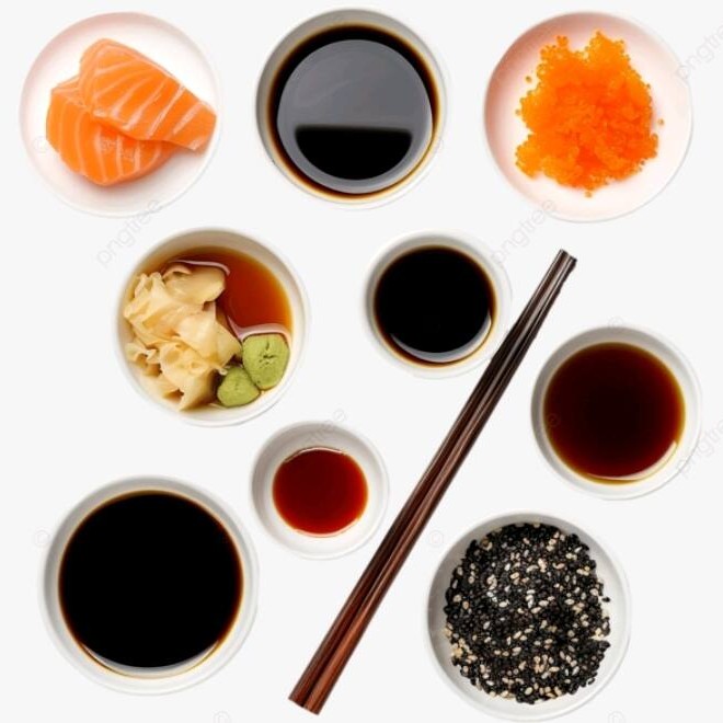 Hashi(1 a 2 pares )+ tare(6 sachê )+ shoyu(6 sachê )+ berço pra molho (2 unidades) + gengibre e wasab,se tiver peças cruas .
