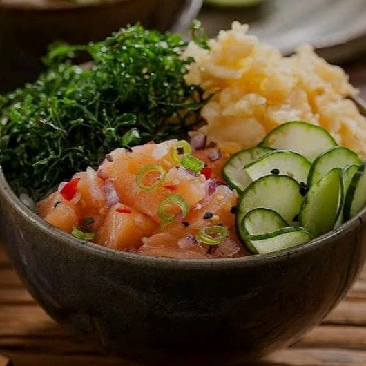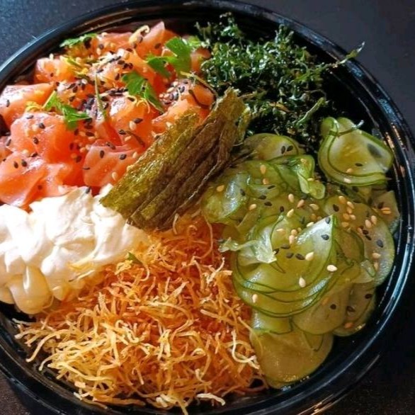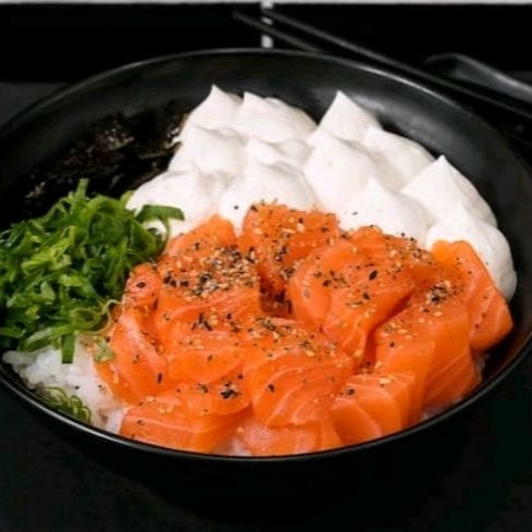 Filé de salmão em cubos, arroz japonês,alga nori e cebolinha.