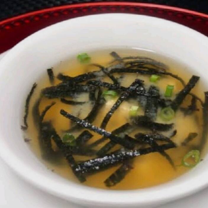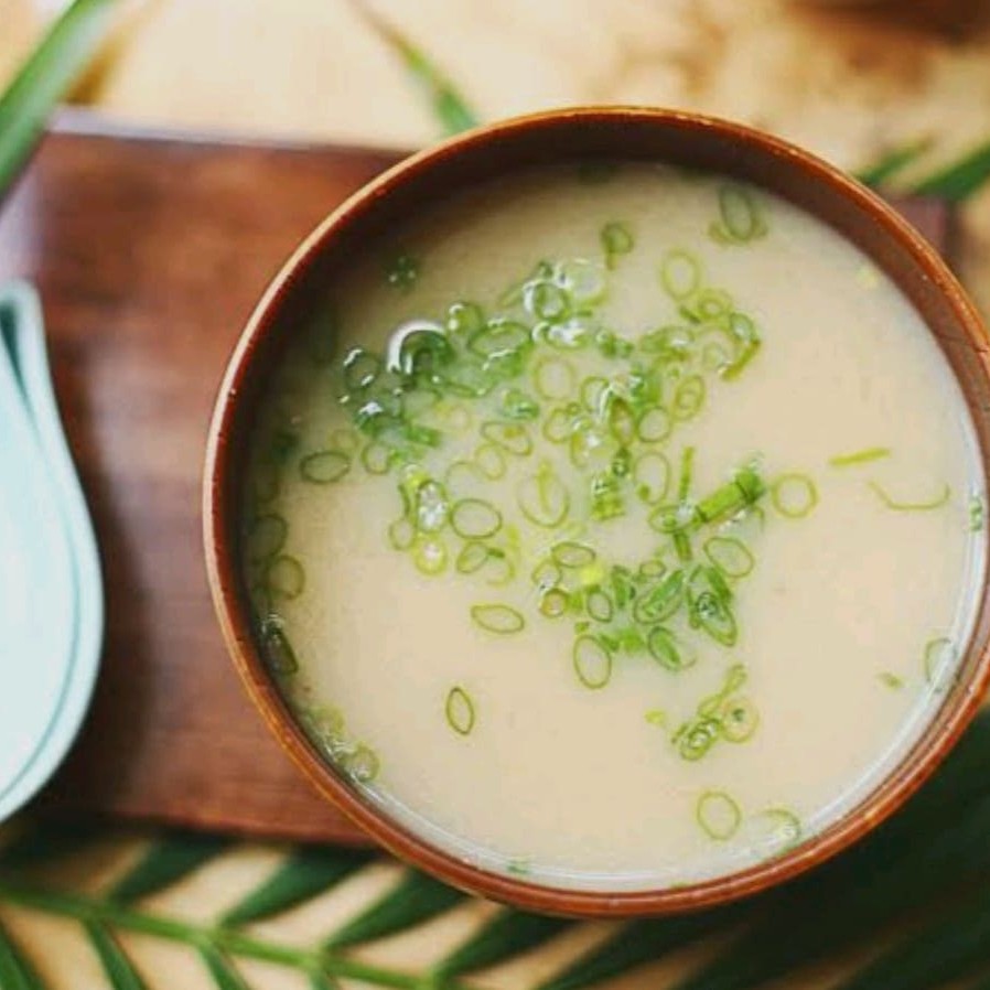 Pasta abase de soja e peixes, dissolvida em água quente finalizada com cebolinha