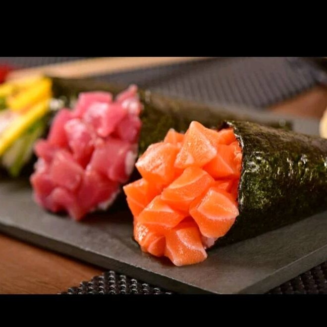 1 temaki salmão fila + 1 temaki salmão hot + temaki atum fila + 1 temaki skin especial