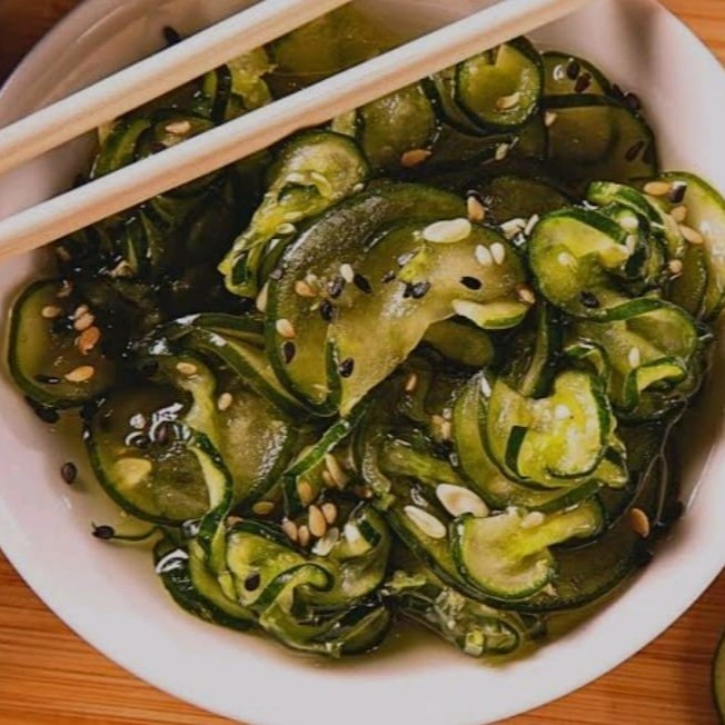 Lâminas de pepino japonês, marinado em molho a base de vinagre, sal e açúcar e gergelim