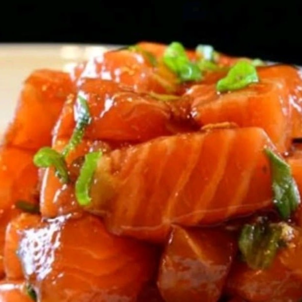Filé de salmão em cubos, cebolinha e gergelim