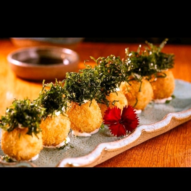 Salmão, creme cheese, arroz e cebolinha ( empanado e frito finalizado com tarê e crispy de couve)