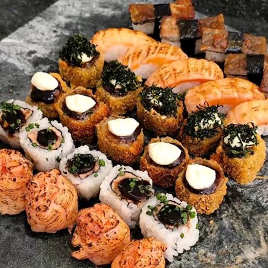 5 Hot ebi tem Doblo + 6 Haru hot salmão + 6 uramaki Filadélfia + 6 uramaki ebi tem + 4 Joy Concha ebi + 2 Joy tartar de salmão + 2 Joy crispy alho poró + 2 sushi camarão + 4 sashimi salmão flambado + 6 hossomaki salmão Filadélfia.