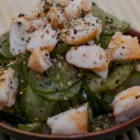 Lâminas de pepino japonês, camarão e gergelim marinado em molho a base de vinagre, sal e açúcar