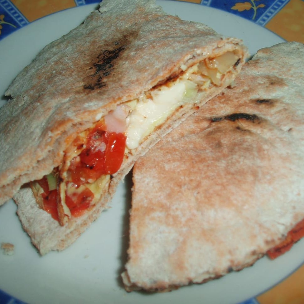 Pão sírio c/ queijo mussarela ,presunto,tomate e orégano.