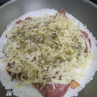 Carne seca desfiada,queijo mussarela,tomate,cebola e orégano.