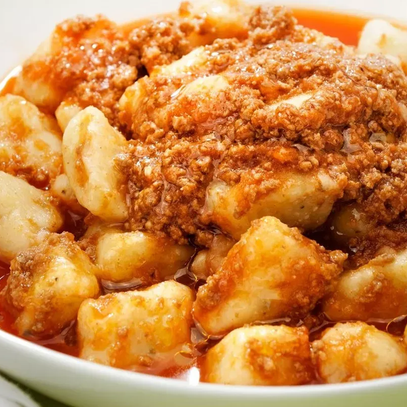 Uma combiçao de nhoque c/Molho vermelho e carne moida e queijo.