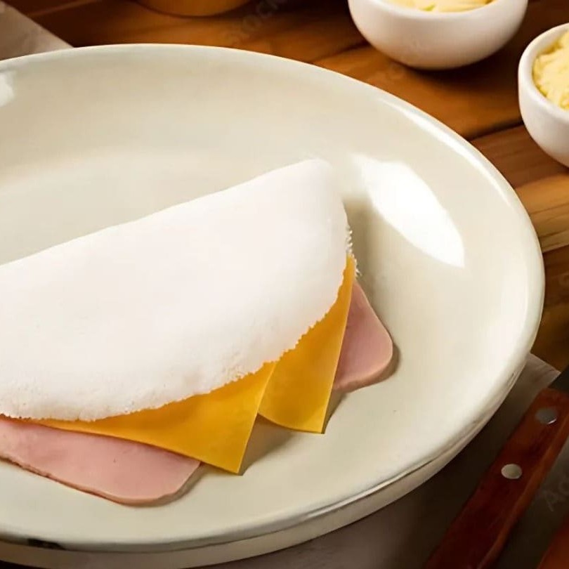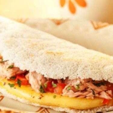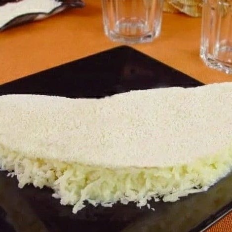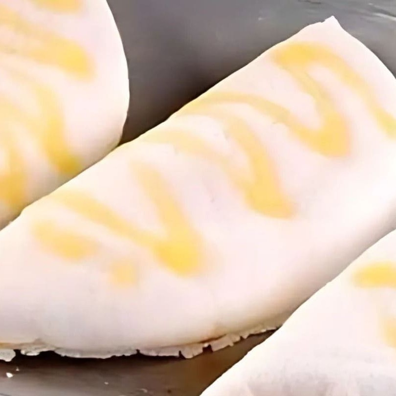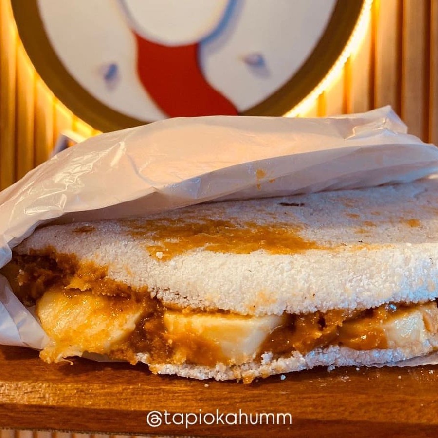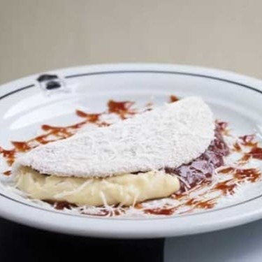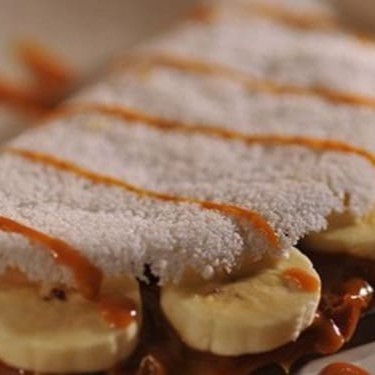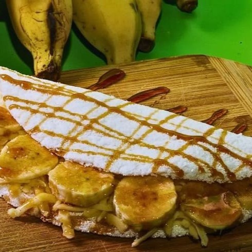 Banana, mussarela, canela, doce de leite, e paçoca de biscoito maisena