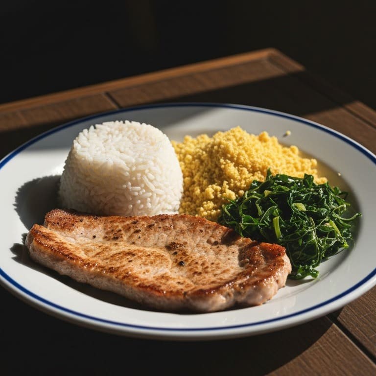 Carré grelhado acompanhdo de arroz branco, farofa da casa, couve mineira e feijão. Obs: Feijão é servido em cima do arroz