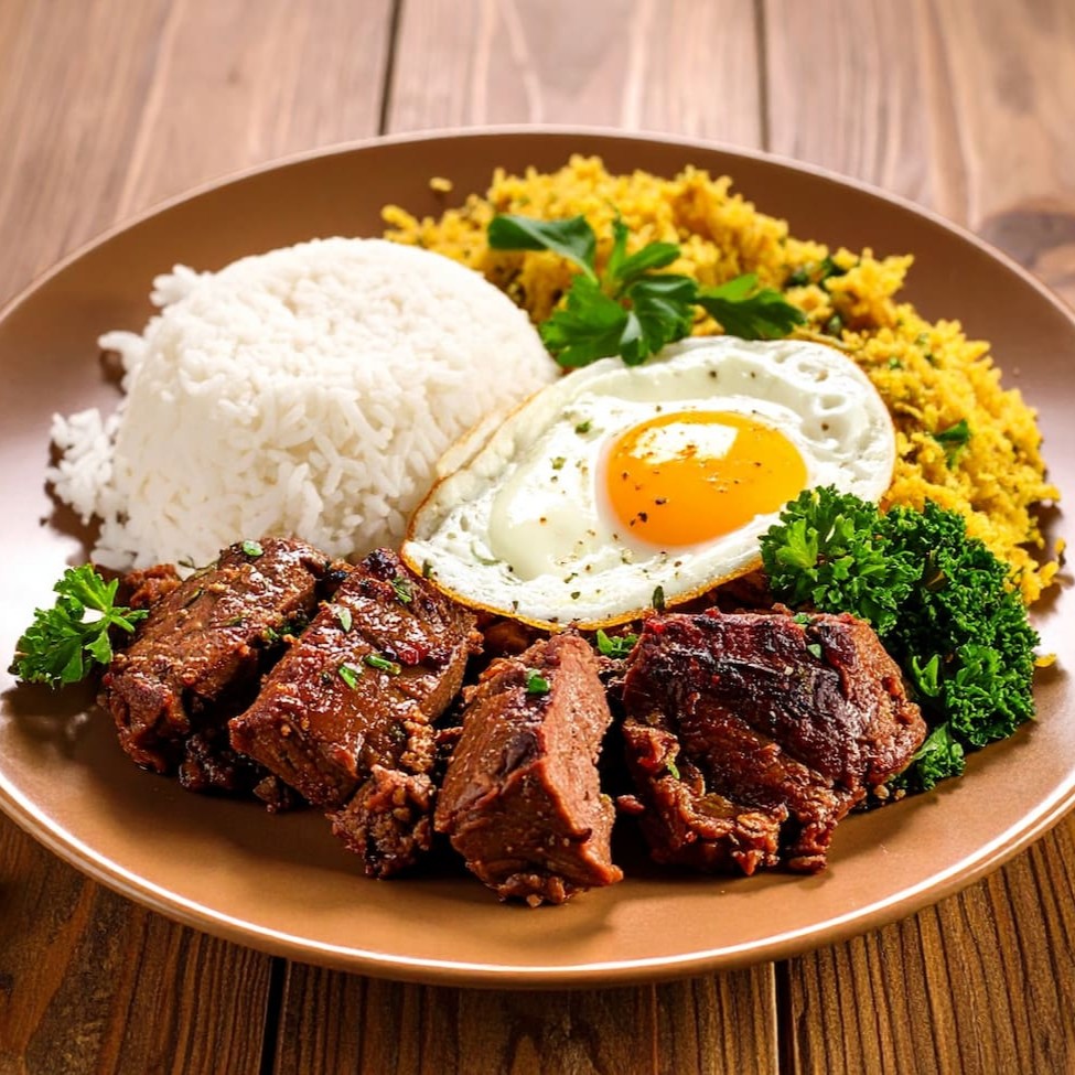 Picadinho de carne acompanhado de arroz branco, feijão, farofa e ovo estalado. obs: feijão servido em cima do arroz