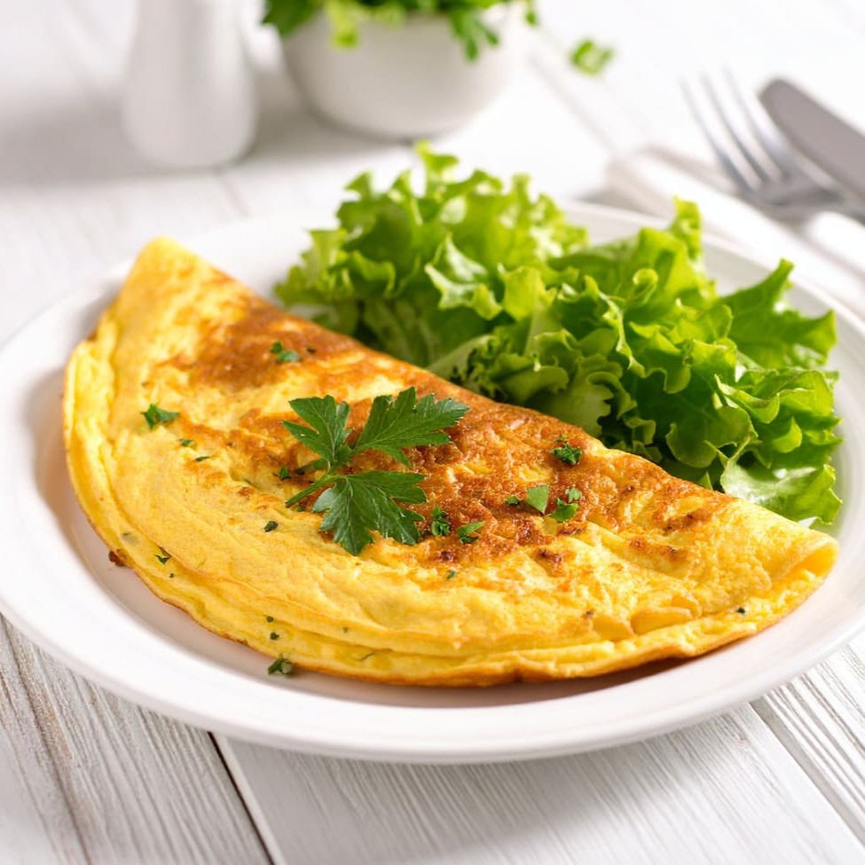 Omelete tradicional com o sabor da sua escolha (napolitano, frango ou minas) acompanhado de salada de sua preferência, de alface fresca ou salada caesar.