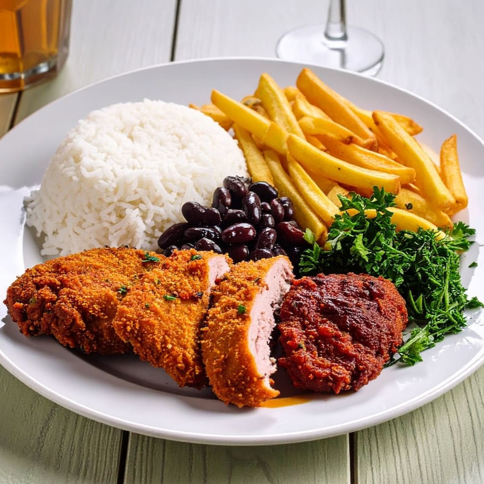 Filé à Milanesa de sua preferência acompanhado de arroz branco, feijão e batata frita. Obs: Feijão vai por cima do arroz