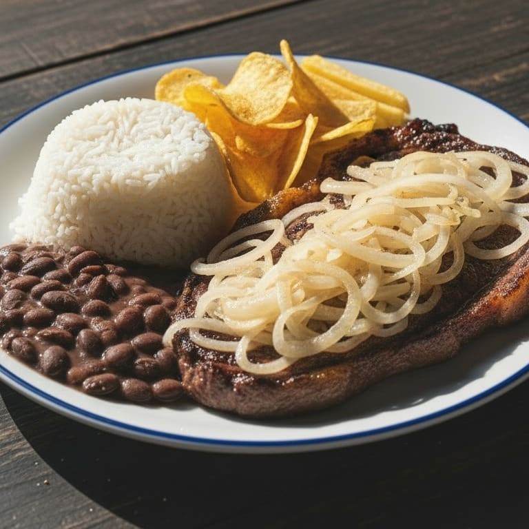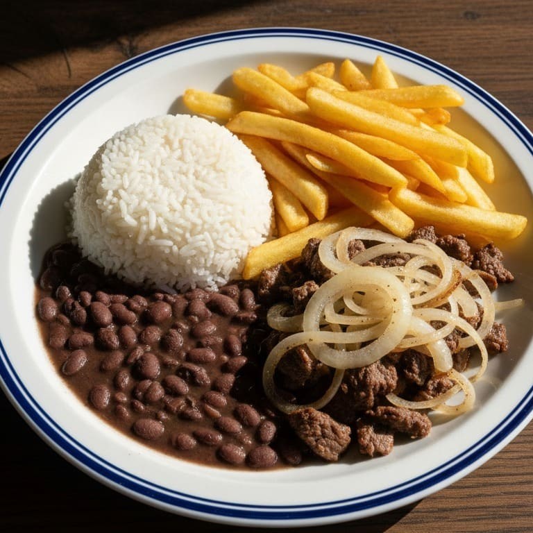 Bife acebolado acompanhado de arroz branco, feijão e batata frita. Obs: Feijão vai por cima do arroz.