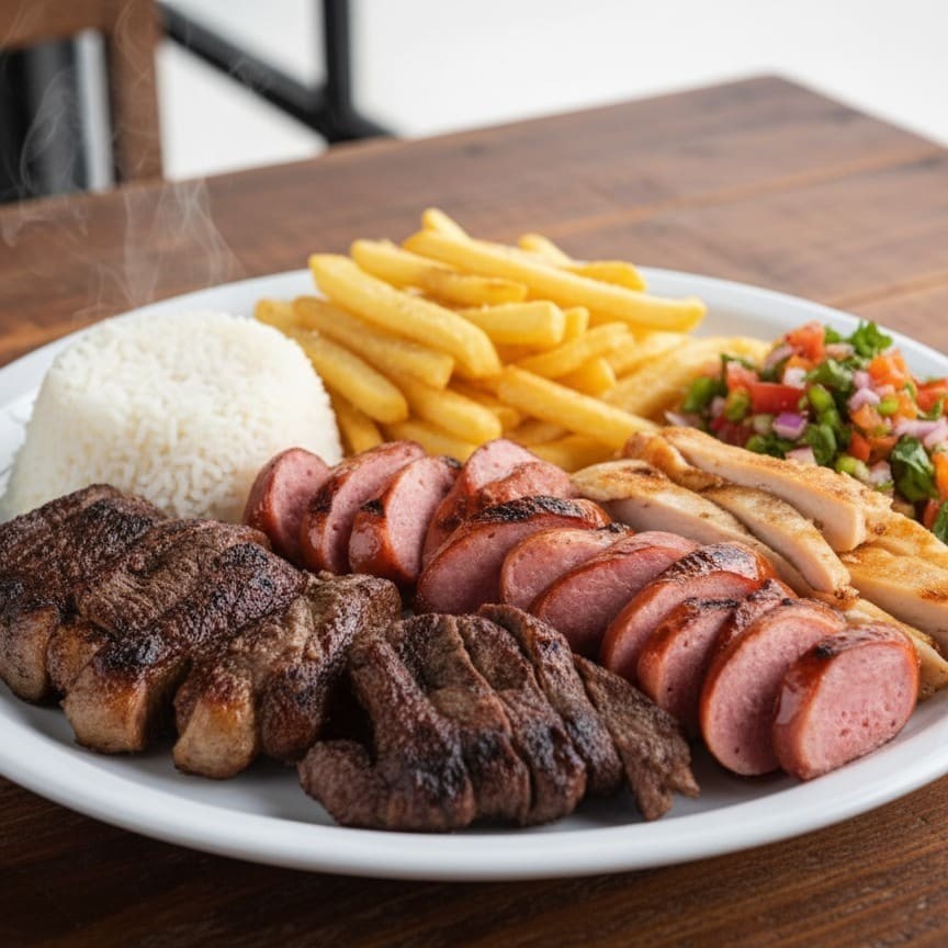 Deliciso churrasco misto acompanhado de arroz branco, batata frita, farofa e molho vinagrete