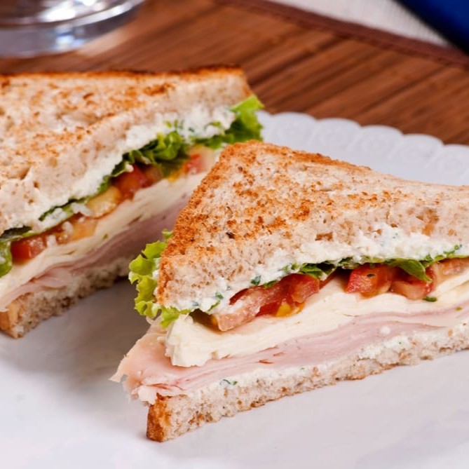 Fatias de queijo de minas com peito de peru defumado, tomates frescos e orégano. Escolha o seu pão favorito!