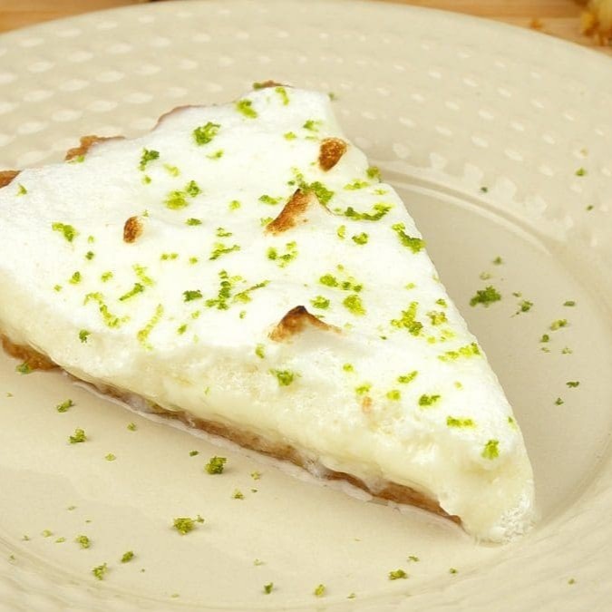 Fatia de torta caseira de limão com massa de biscoito e raspas de limão.