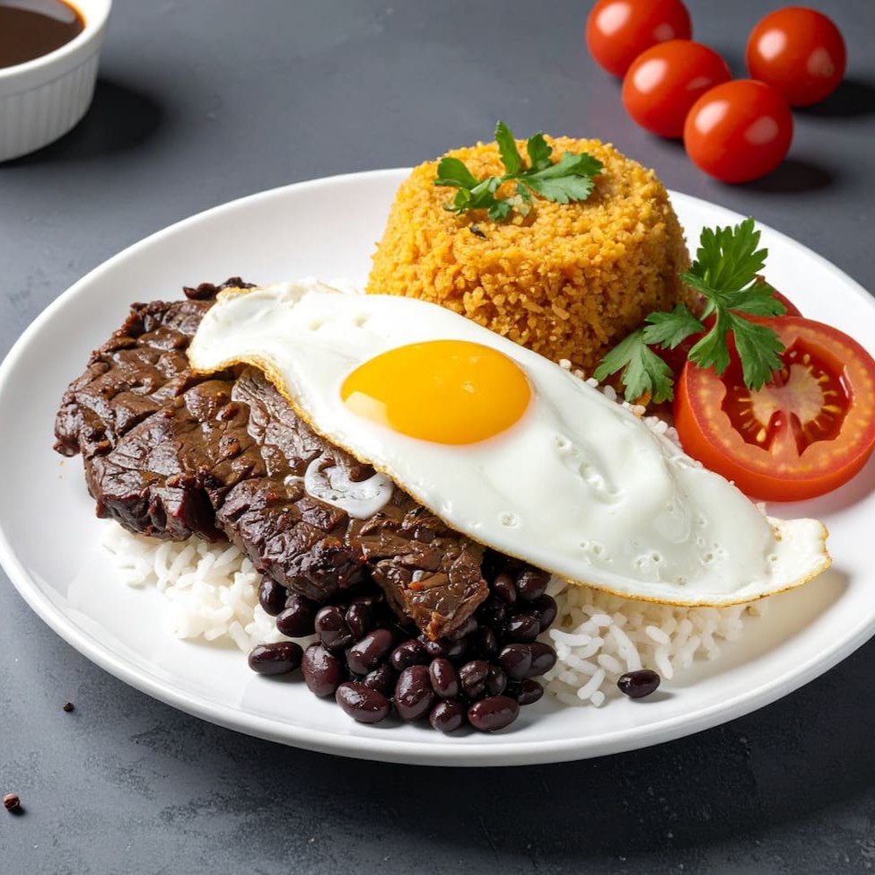 Bife à Cavalo acompanhado de arroz branco, feijão e farofa. Obs: Feijão vai por cima do arroz.