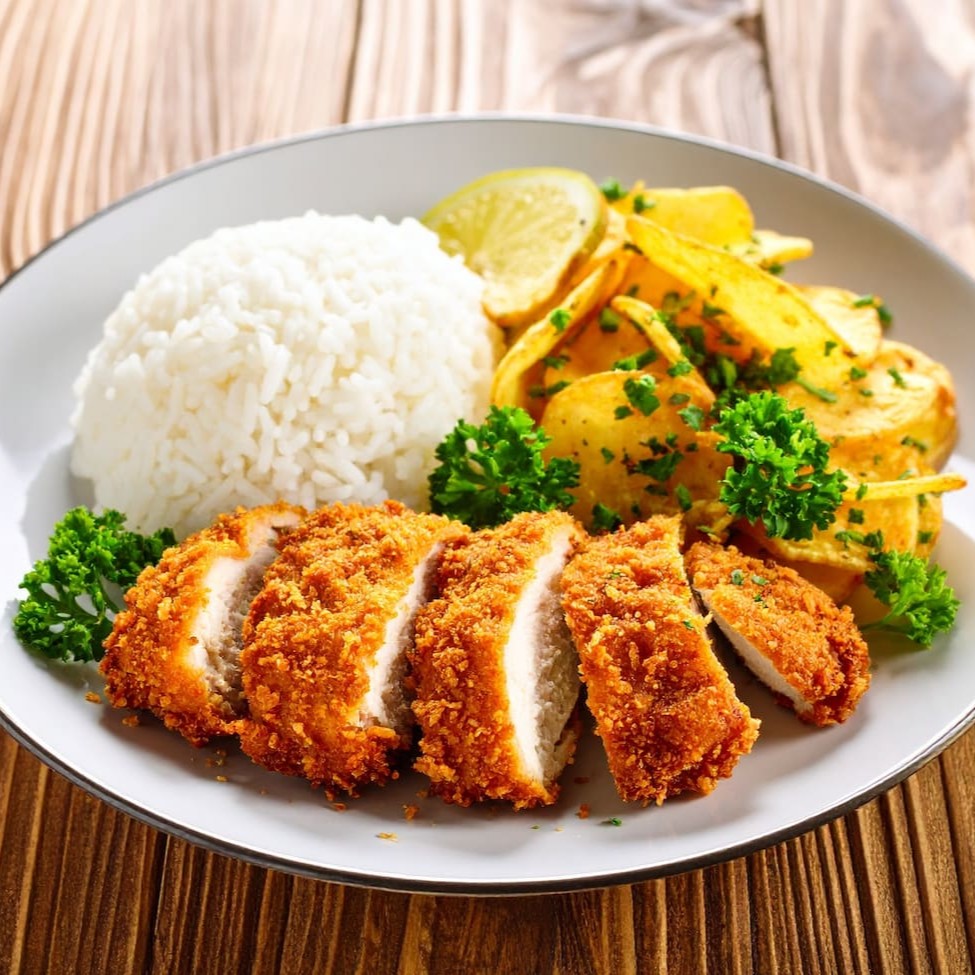Frango crocante à milanesa acompanhado de arroz e batata frita.