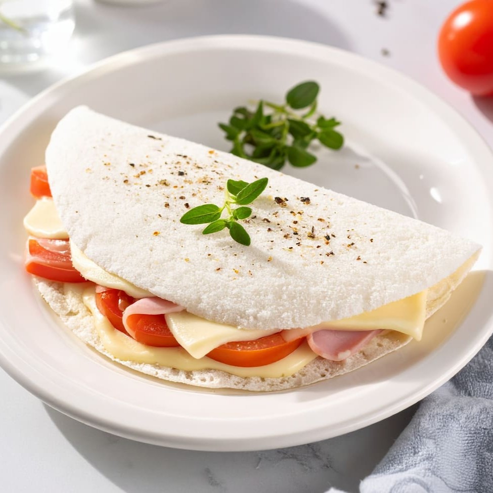 Tapioca com recheio de queijo prato derretido, fatias de presunto, rodelas de tomate e orégano.