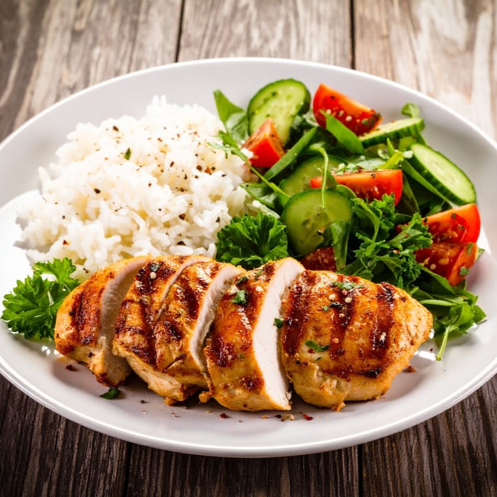 Filé de frango grelhado com arroz branco e acompanhamentos de salada ou legumes à sua escolha.