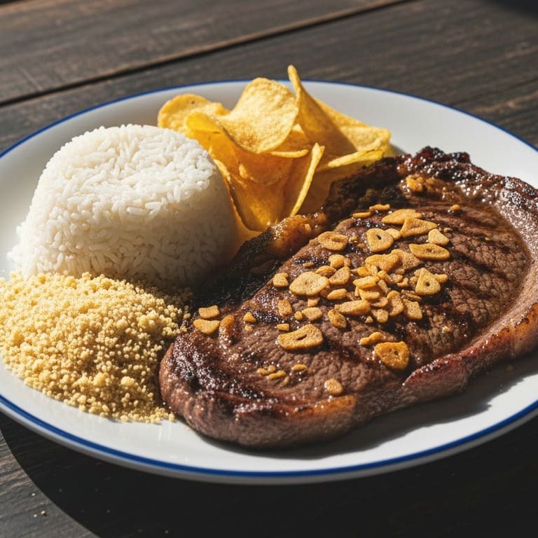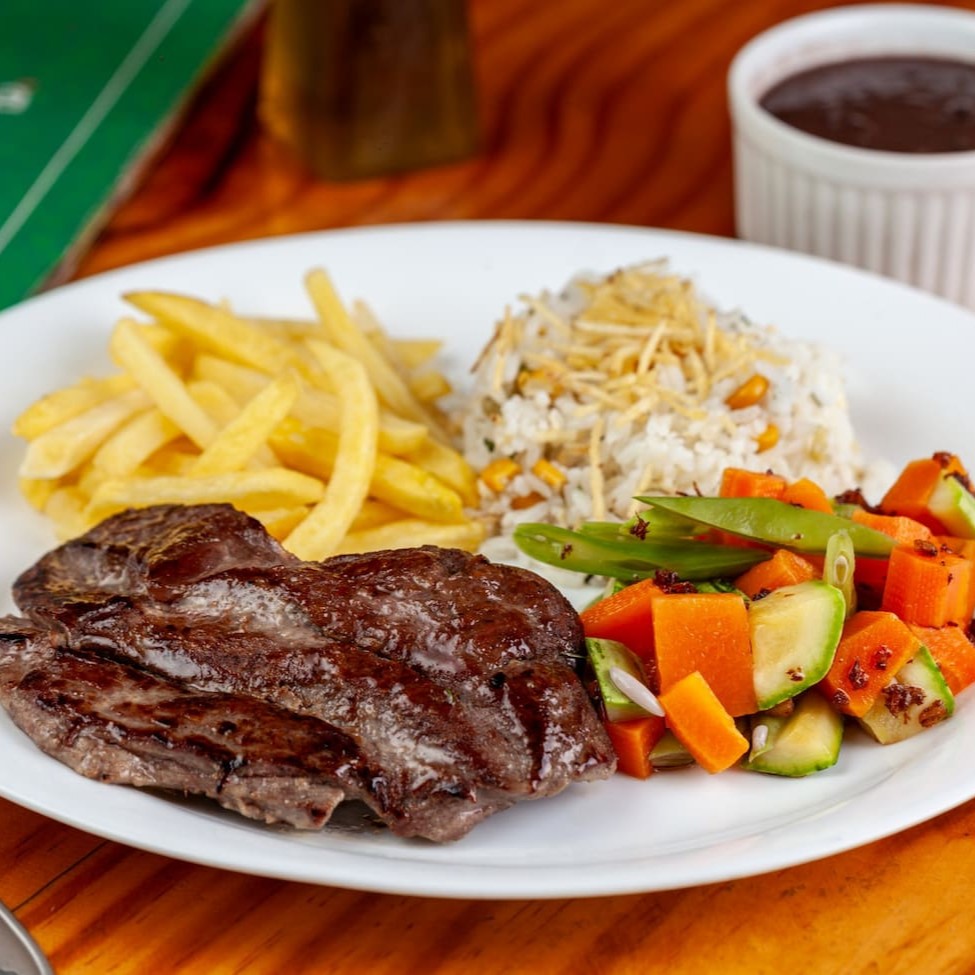 Delicioso bife de Contra-Filé grelhado com alho frito, acompanhado de arroz branco, farofa da casa e batata frita.