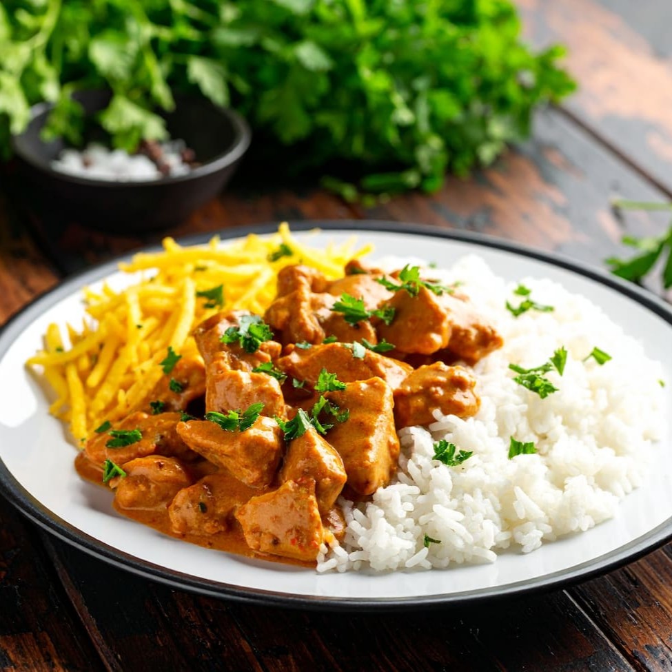 Strogonoff cremoso, acompanhado de arroz branco e batata frita.