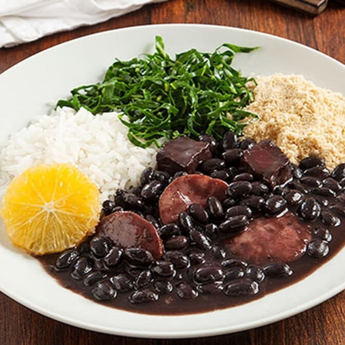 Feijoada acompanhada de arroz branco, farofa, couve e laranja.