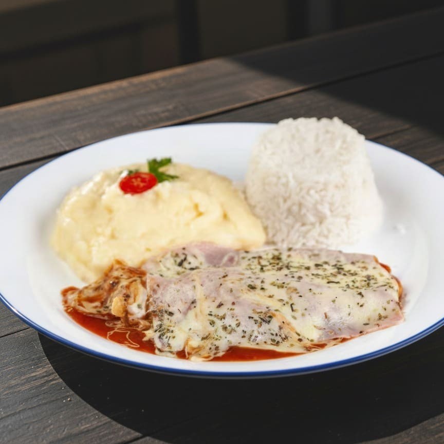 Filé à Parmegiana de sua preferência (frango ou carne), com acompanhamento de arroz e purê ou batatas fritas