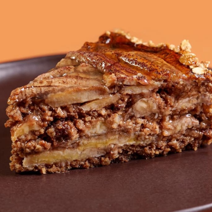 Fabricação própria de torta integral de banana feita com açúcar mascavo, farinha de trigo 100% integral, aveia e granola.