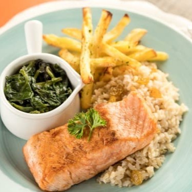 Caiu na rede! Um filezão Salmao especialmente preparado e combinado com arroz, feijão bem temperado e 1 acompanhamento a escolher. Quem vamos?