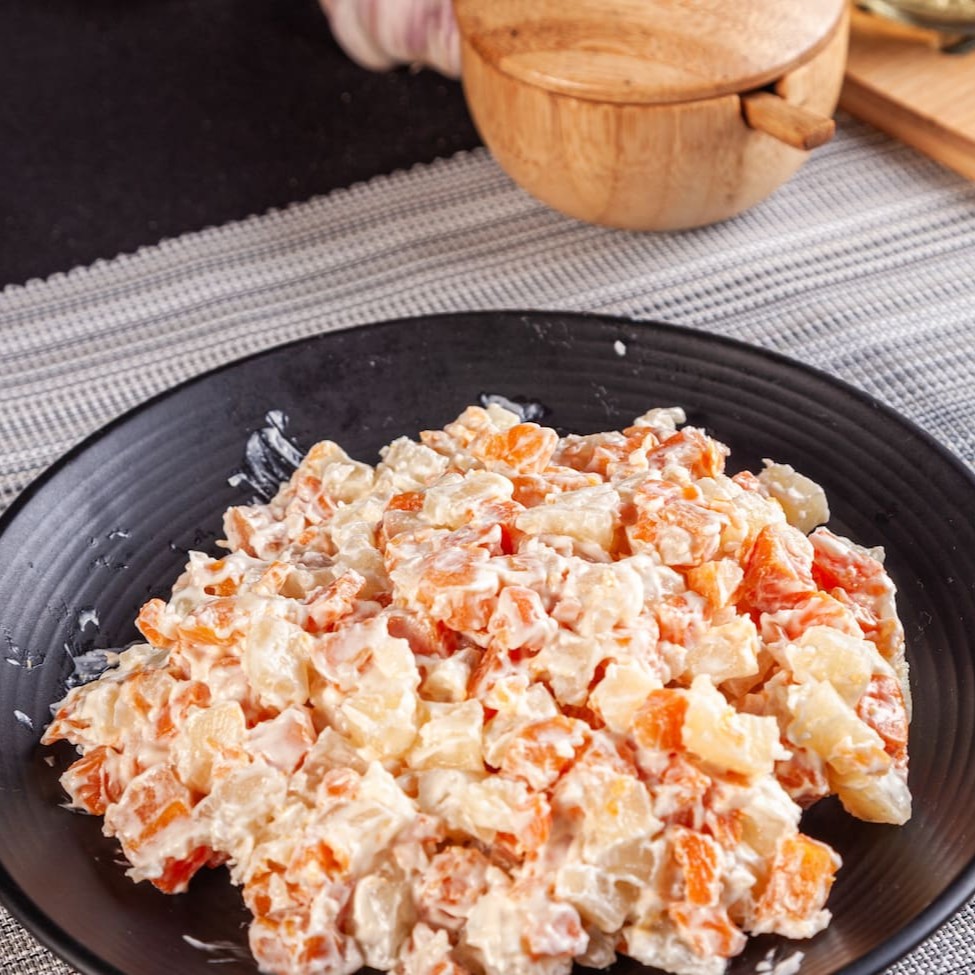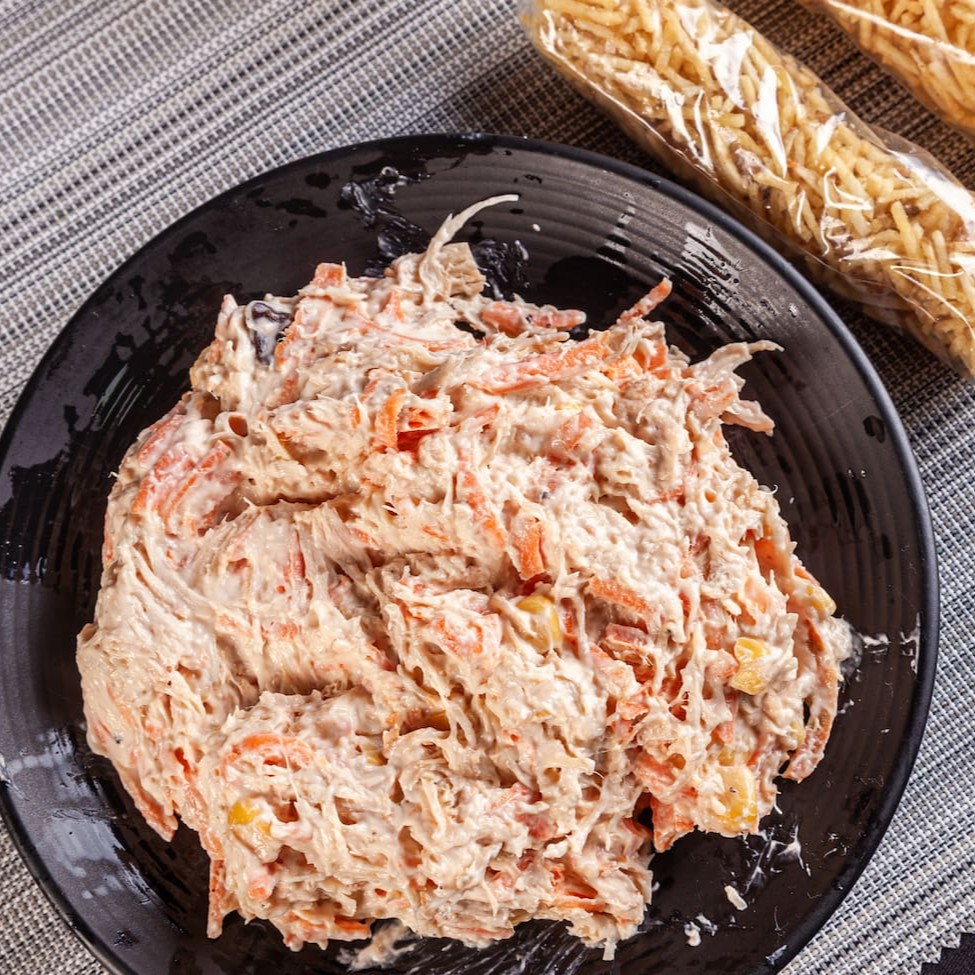 Frango,cenoura,milho,passas,batata palha,maionese creme de leite.