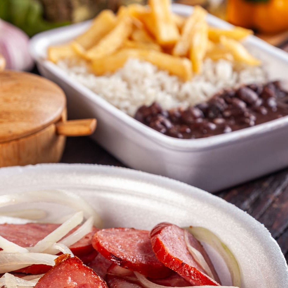 Uma, duas, três... (80 g) linguiças Calabresa. Ainda acompanha arroz, feijão temperadinho, vai ficar de fora!!!