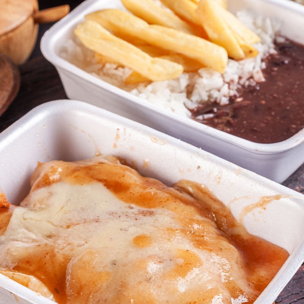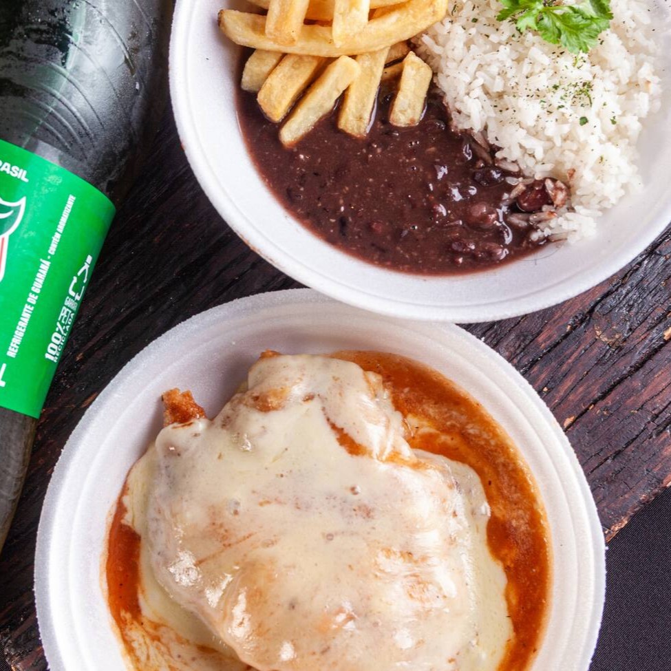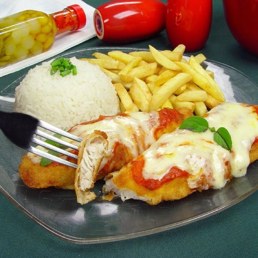 Vontade de parmegiana, né, meus queridos? 2 Refeicao de Frango empanado e coberto com queijo e um suculento molho de tomate. Acompanha arroz branco feijao e Fritas
