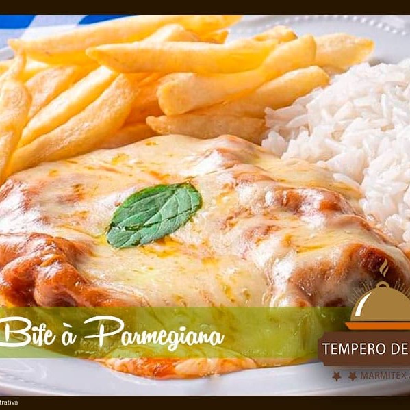 Vontade de parmegiana, né, meus queridos? Carne empanada e coberta com queijo e um suculento molho de tomate. Acompanha arroz branco feijao 1 acompanhamento a escolher.