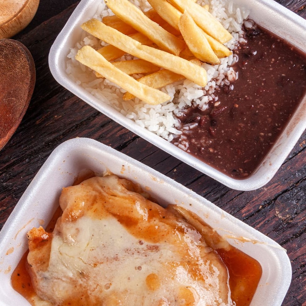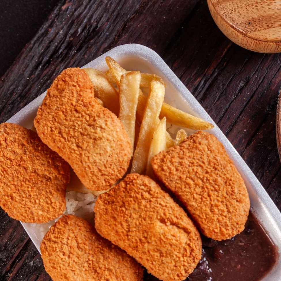 Bom, bonito e baratíssimo, do jeito que o brasileiro gosta! 2 Refeicao de frango deliciosamente empanados e servidos junto com arroz, feijão e Fritas